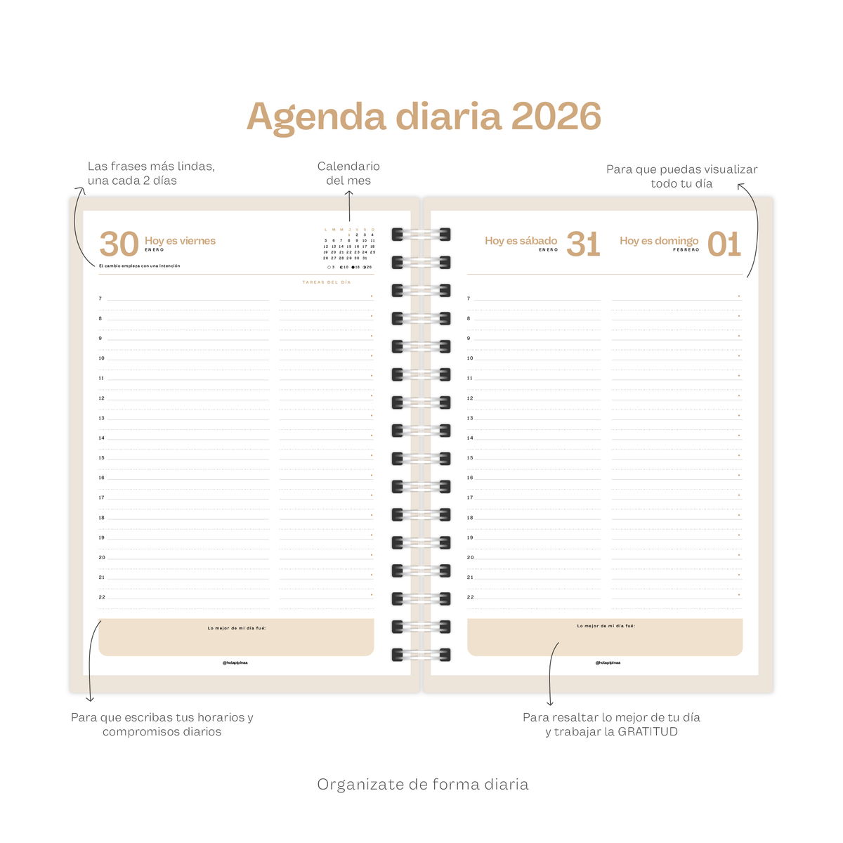 • Agenda Diaria: un día por página (excepto sábado y domingo).