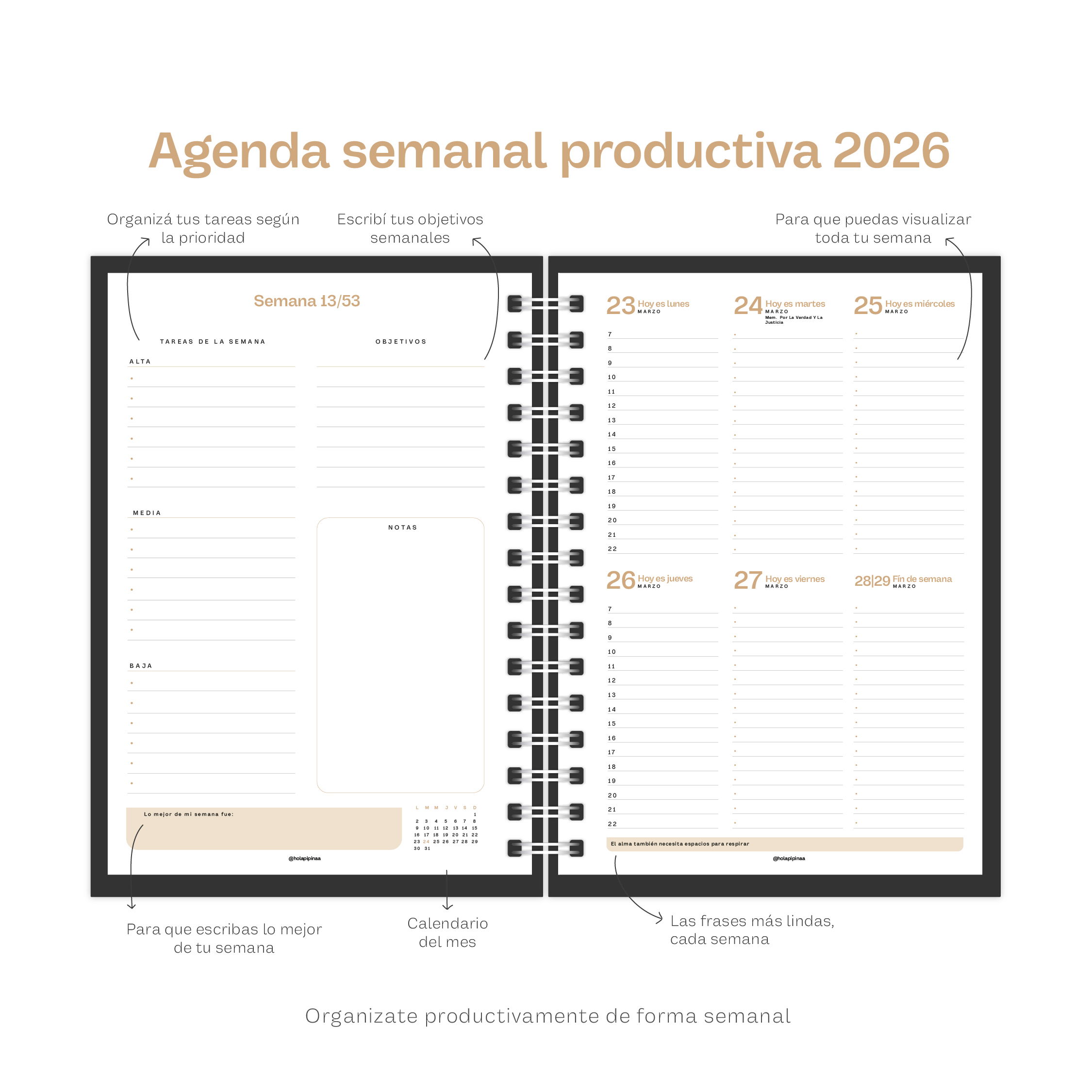 • Agenda Semanal Productiva: con enfoque en metas, prioridades y balance.