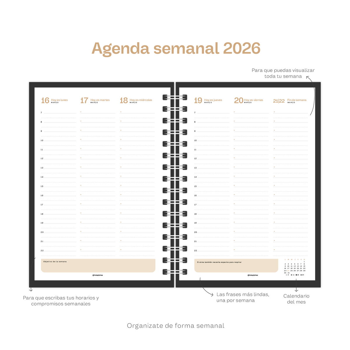 • Agenda Semanal Productiva: con enfoque en metas, prioridades y balance.