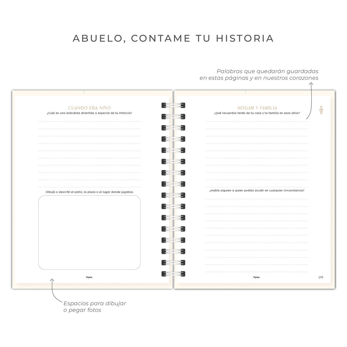 preguntas que despiertan la memoria, espacios visuales para fotos, lugares para escribir cartas y frases que abrazan.